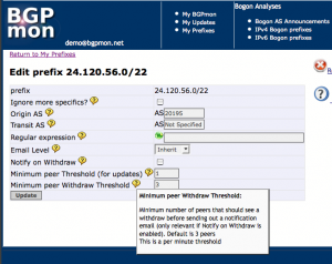 It actually wasn't that much work because this feature was already in use for the "Notify on withdraw" functionality. This will sent out a notification email if at least 3 peers detected a withdraw for your prefix. In this case the threshold of 3 was hard coded in the software. I rewrote some of the backend software as well as the web interface to add user configurable minimum peer threshold for both updates as well as withdraws.